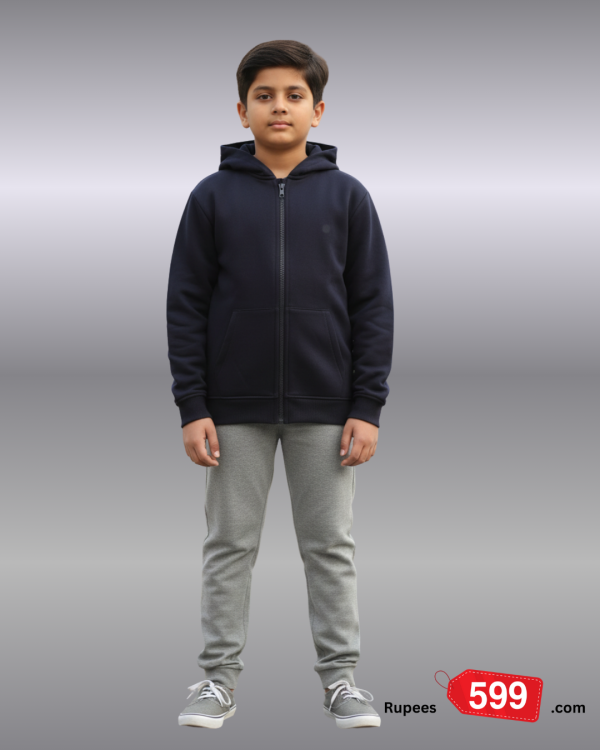 Designed with a classic navy colour and a functional hood, it offers light warmth and protection, making it ideal for casual outings, school wear, or travel. The front zip closure allows easy wear, while the regular fit ensures freedom of movement for active kids.