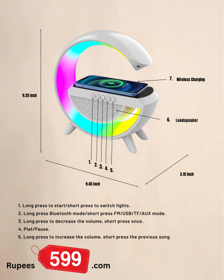 • Multi-Functional: Combines lamp, speaker, and wireless charger.