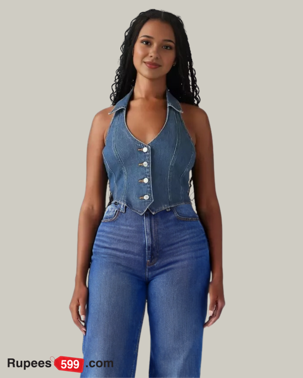 This Denim Halter Top is made from soft cotton denim that feels comfortable and cool to wear. It has no sleeves and a V-shaped front with buttons, and you can tie it around your neck to fit just right. The top is a little short and fits close to your body, making it great for warm days.